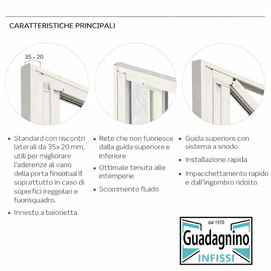 • Sistema di tenuta al vento: funzionalità brevettate che impediscono la fuoriuscita della rete sia dalla guida superiore che da quella inferiore.